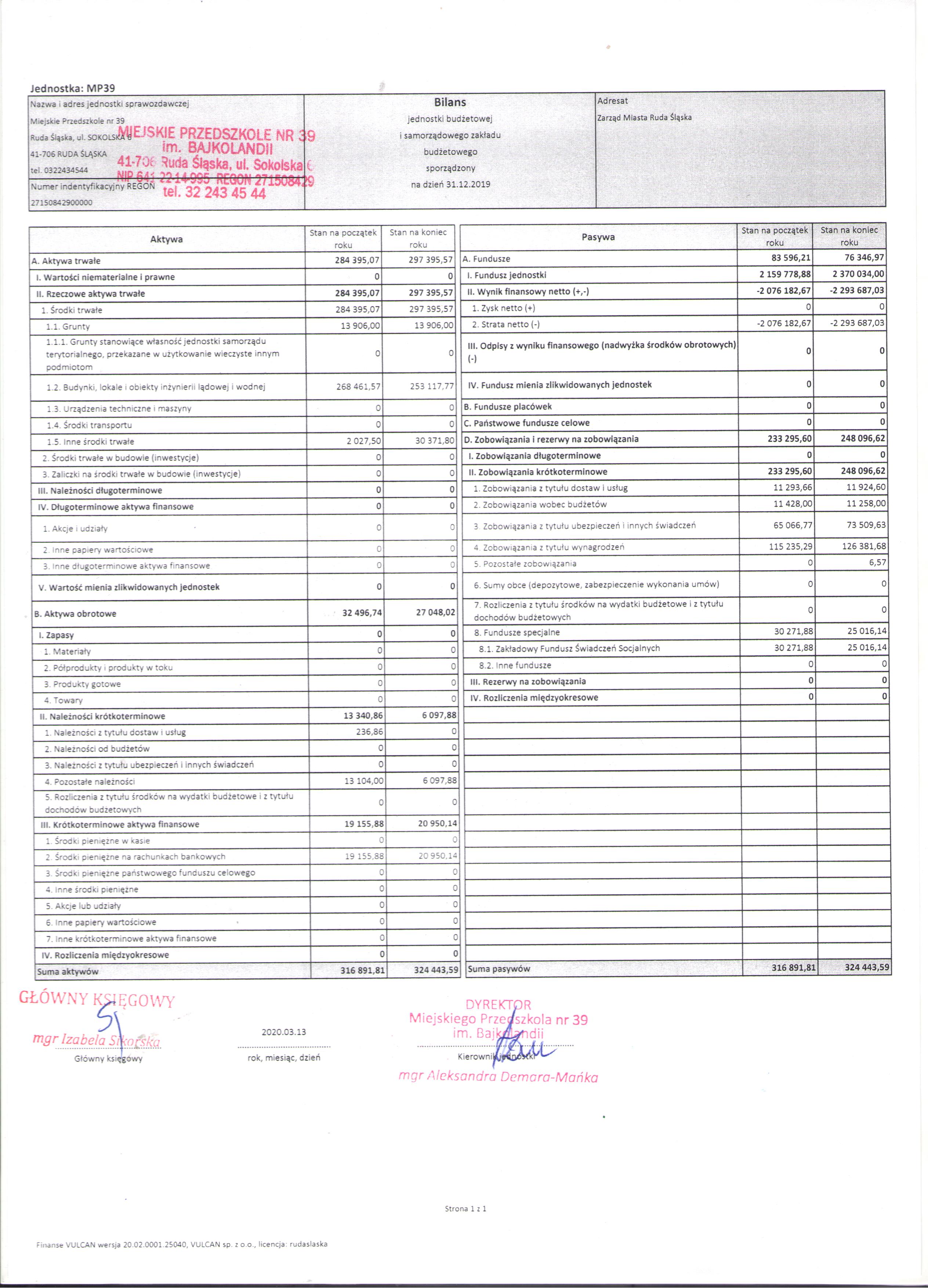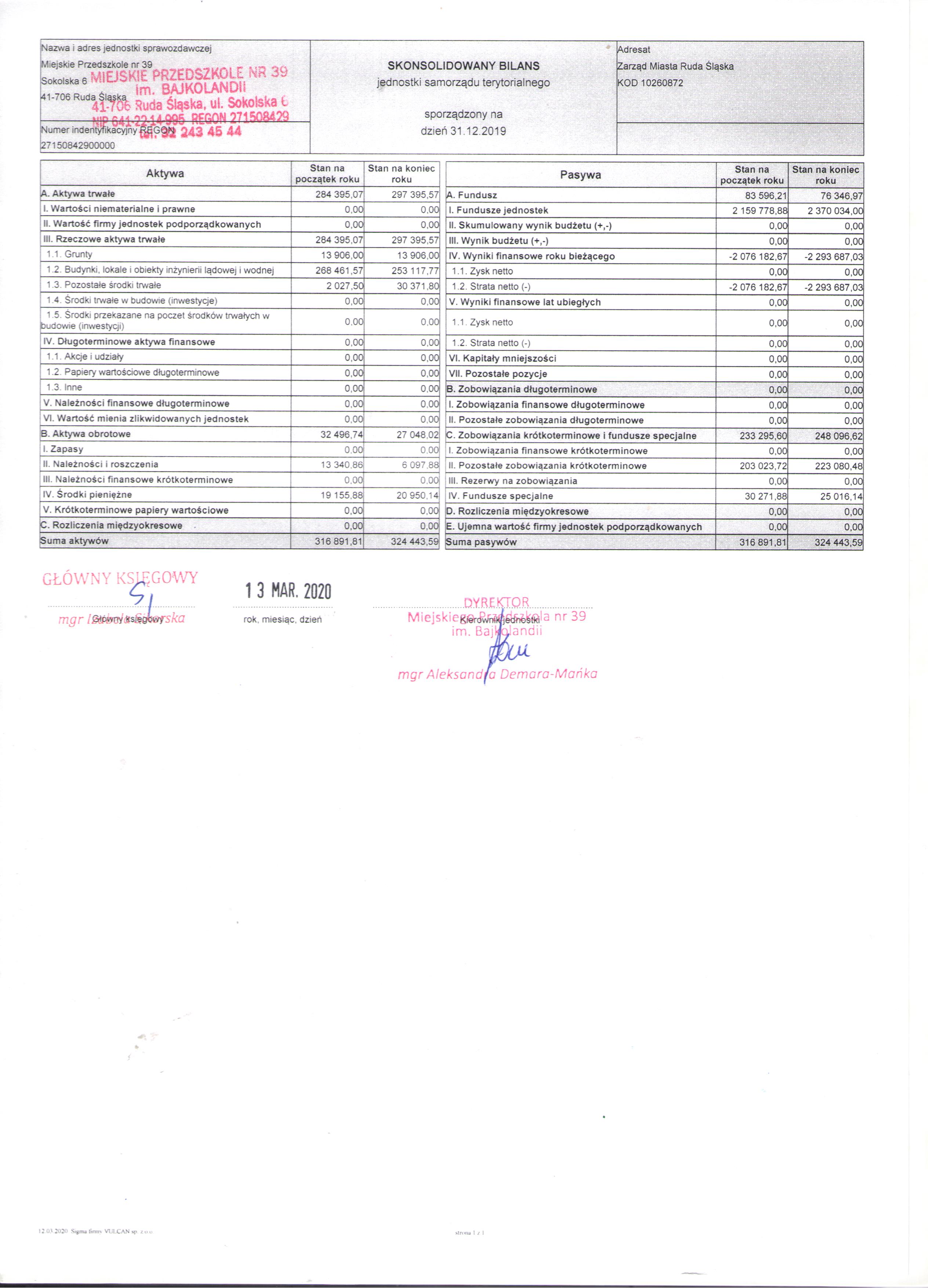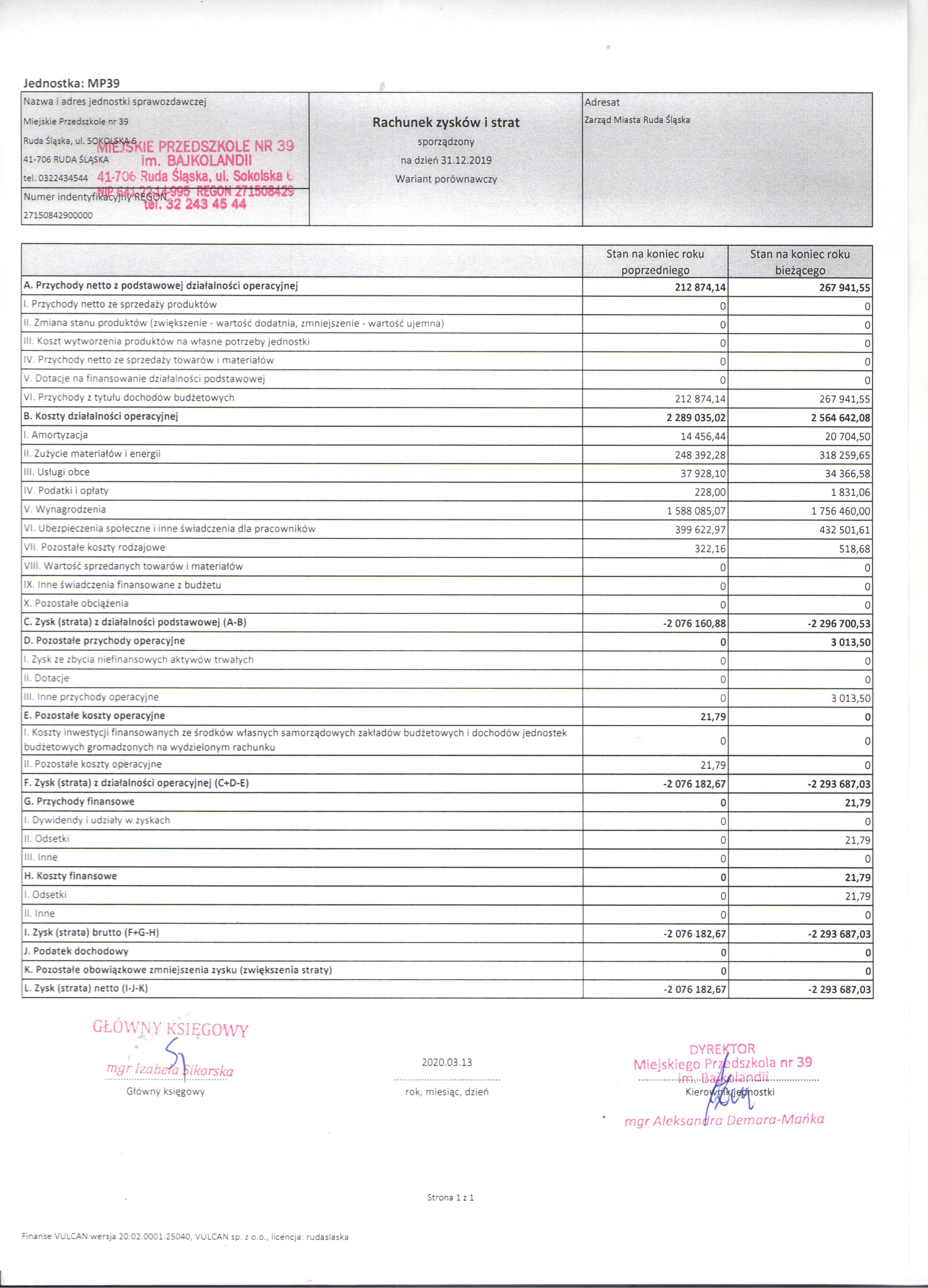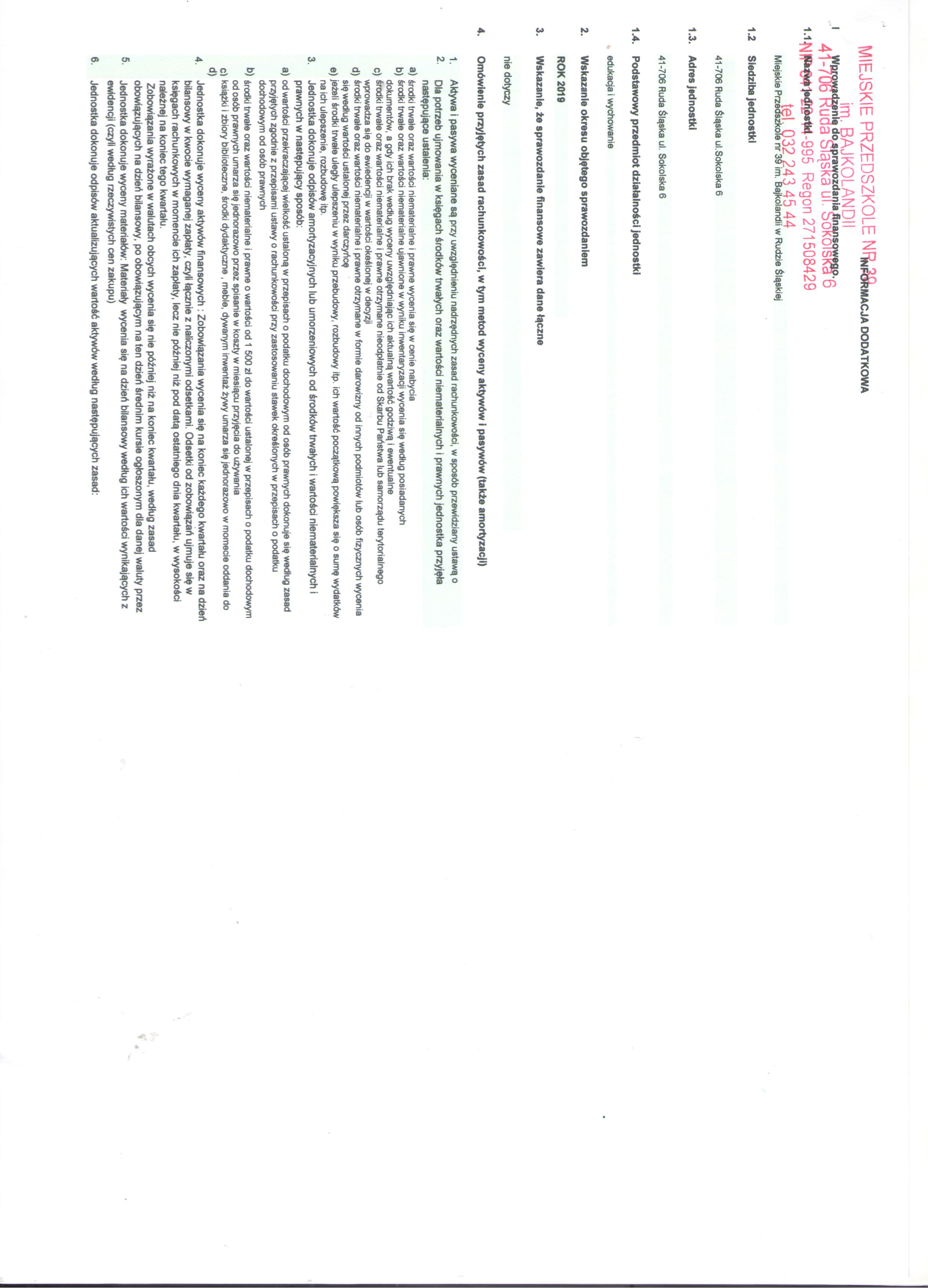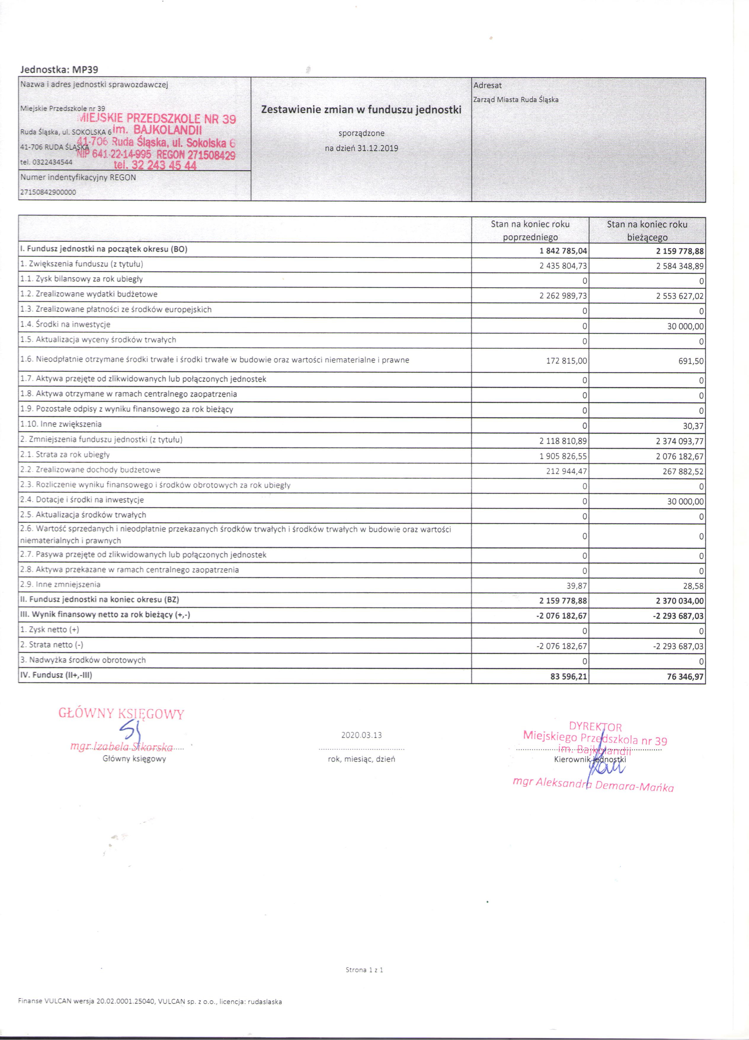 Sprawozdanie finansowe za 2023 rokUtworzono: 07 maj 2024 | Poprawiono: 12 czerwiec 2024 | Opublikowano: 07 maj 2024 | Aleksandra Demara-Mańka | Drukuj | E-mail | Odsłony: 1088 Sprawozdanie finansowe za 2023 rok Załączniki: zestawienie zmian w funduszu 2023.pdf[ ]262 kB2024-06-12 11:08 bilans 2023.pdf[ ]271 kB2024-06-12 11:08 rachunek zysków i strat 2023.pdf[ ]267 kB2024-06-12 11:08 bilans skonsolidowany 2023.pdf[ ]195 kB2024-06-12 11:08 Informacja dodatkowa__Miejskie Przedszkole Nr 39.pdf[ ]363 kB2024-06-12 11:08