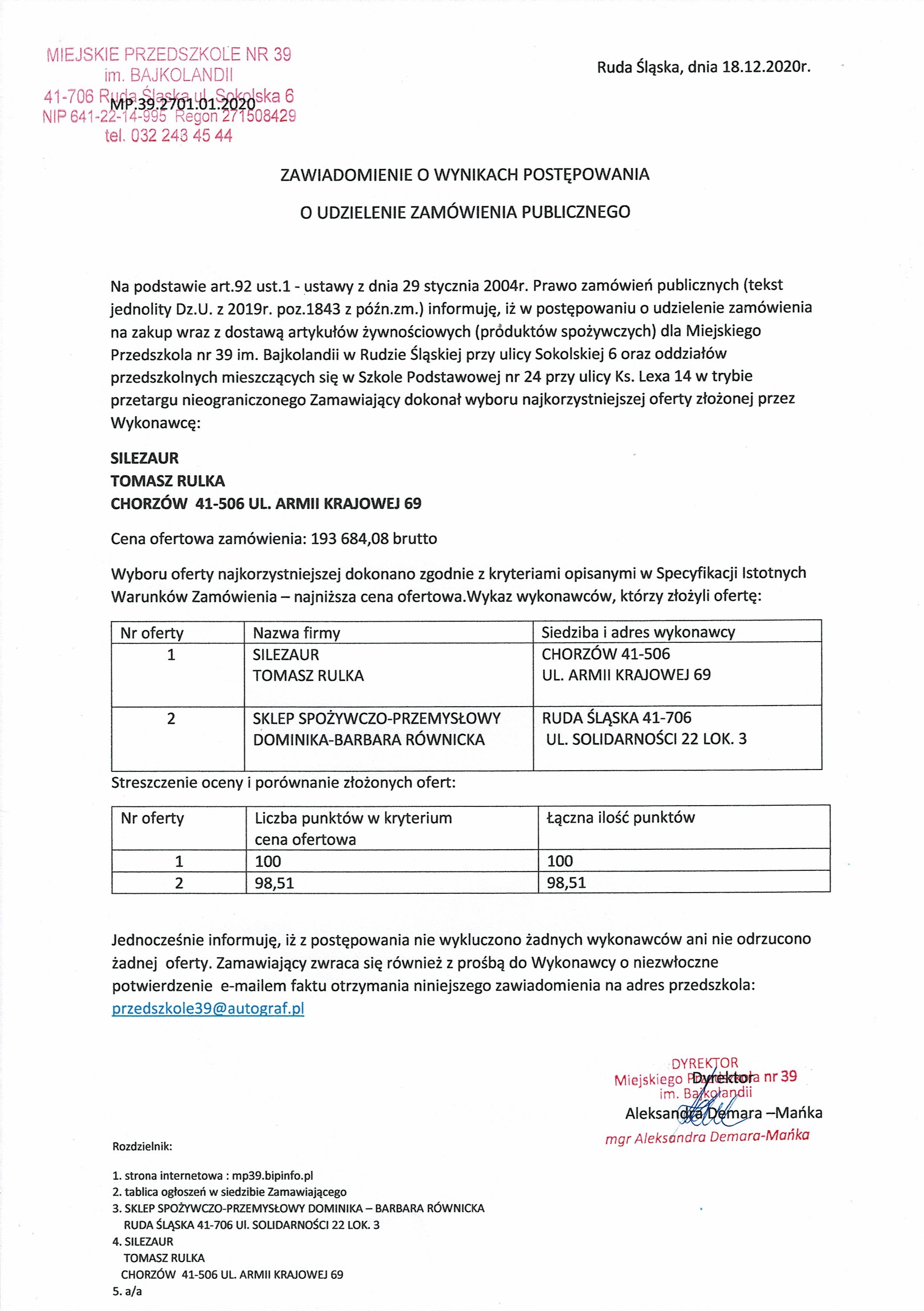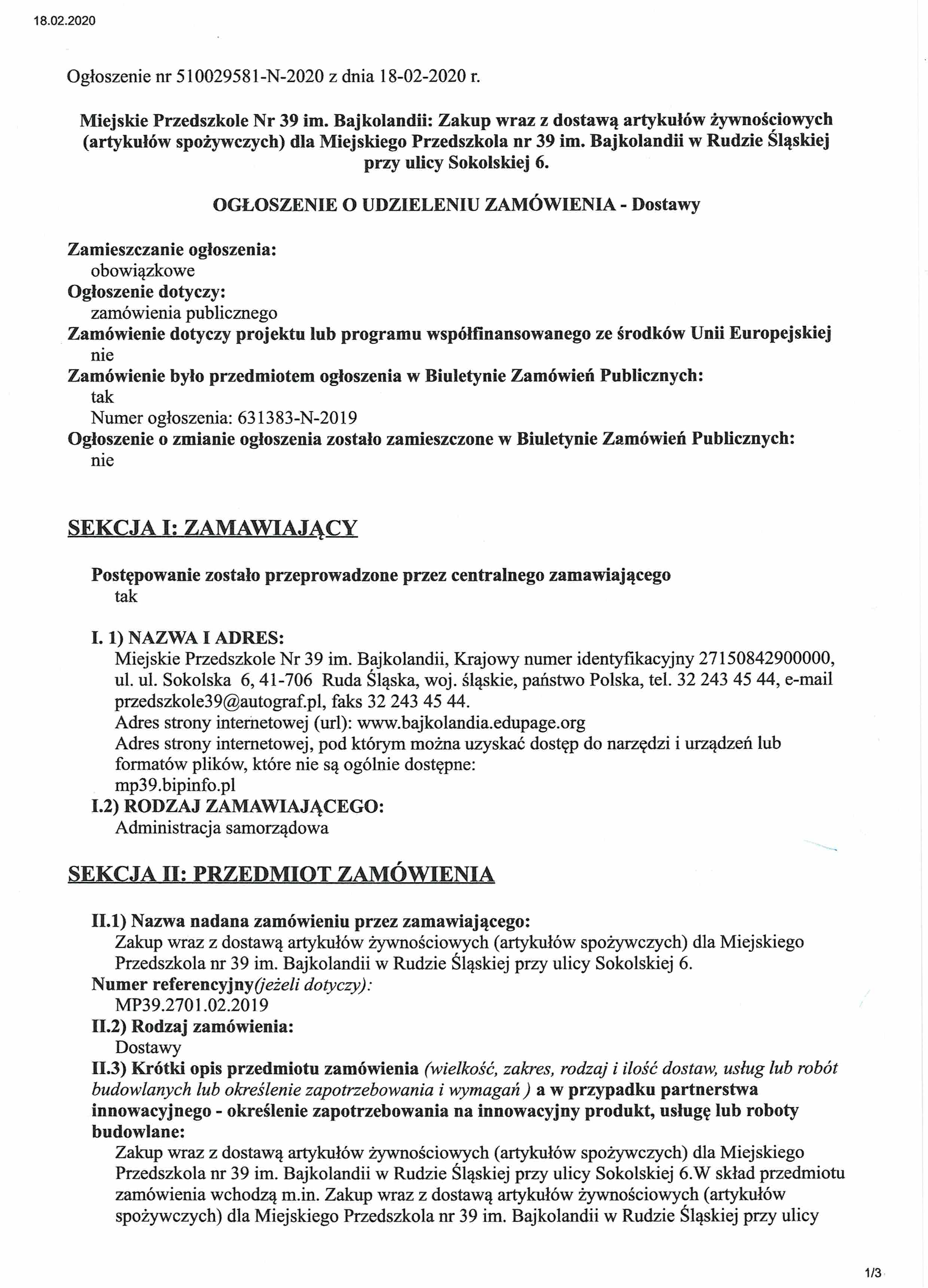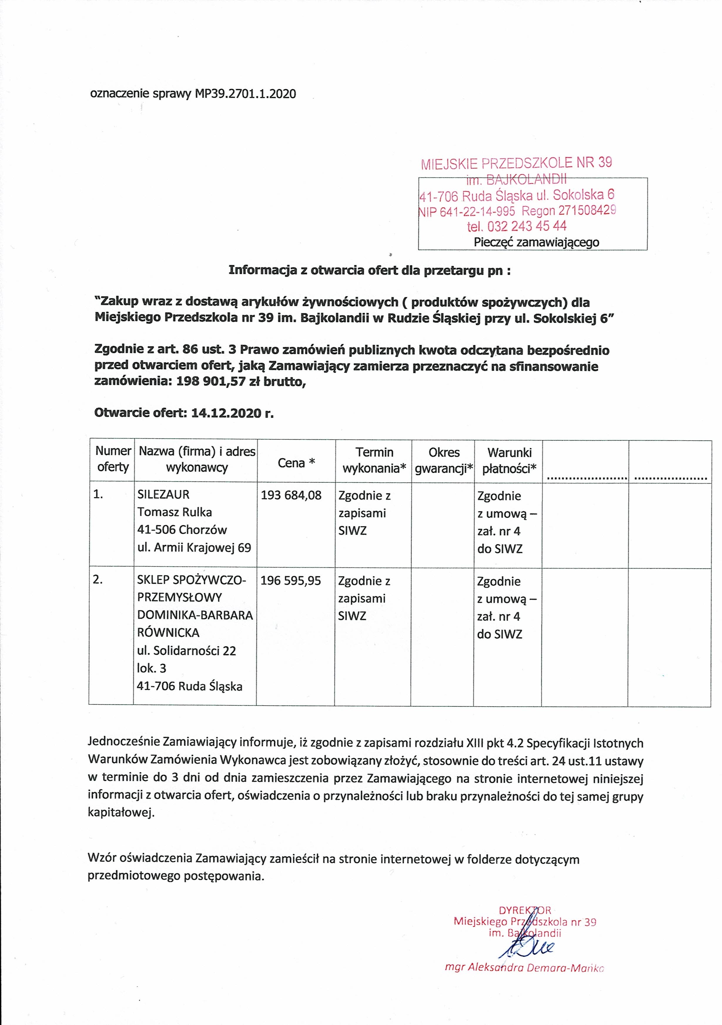 Miejskie Przedszkole Nr 39 im. Bajkolandii: Zakup wraz z dostawą artykułów żywieniowych (artykułów spożywczych) dla Miejskiego Przedszkola nr 39 im. Bajkolandii w Rudzie Śląskiej przy ulicy Sokolskiej 6