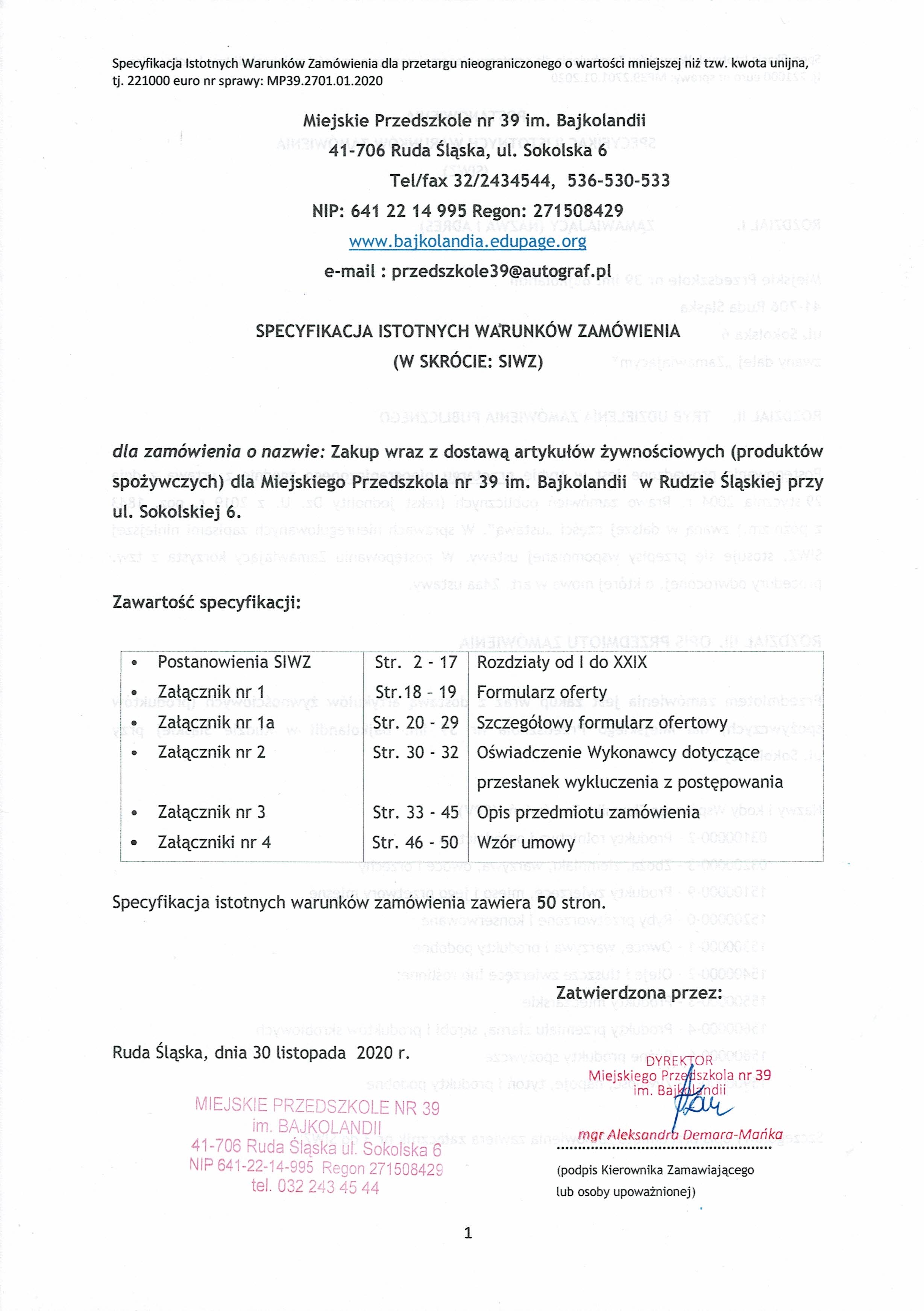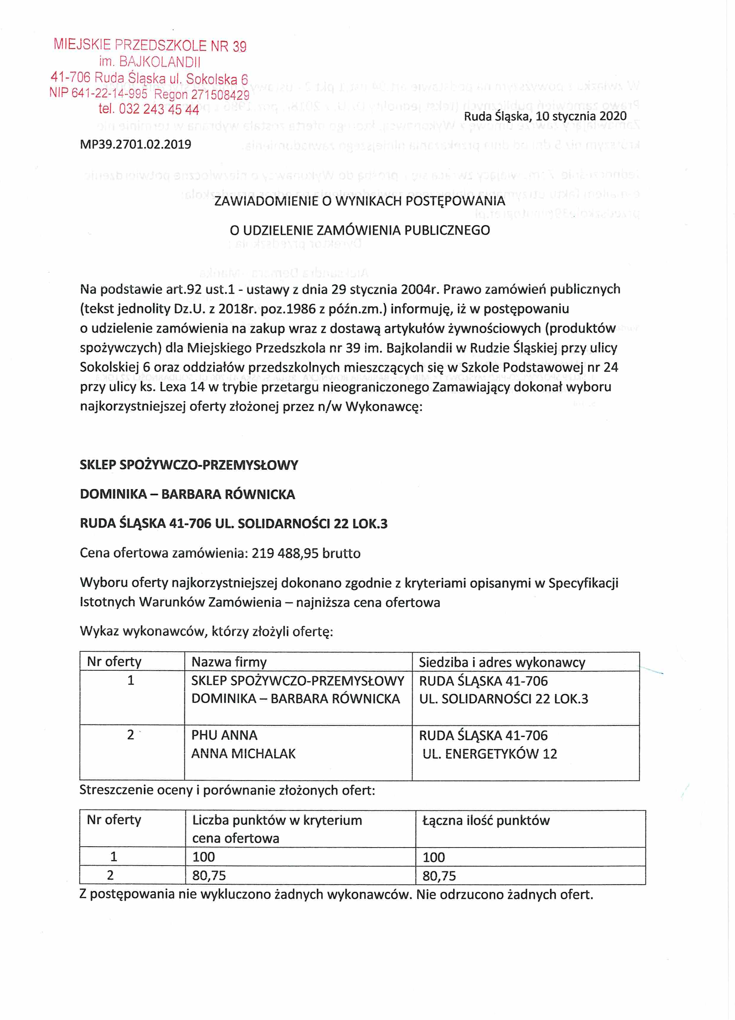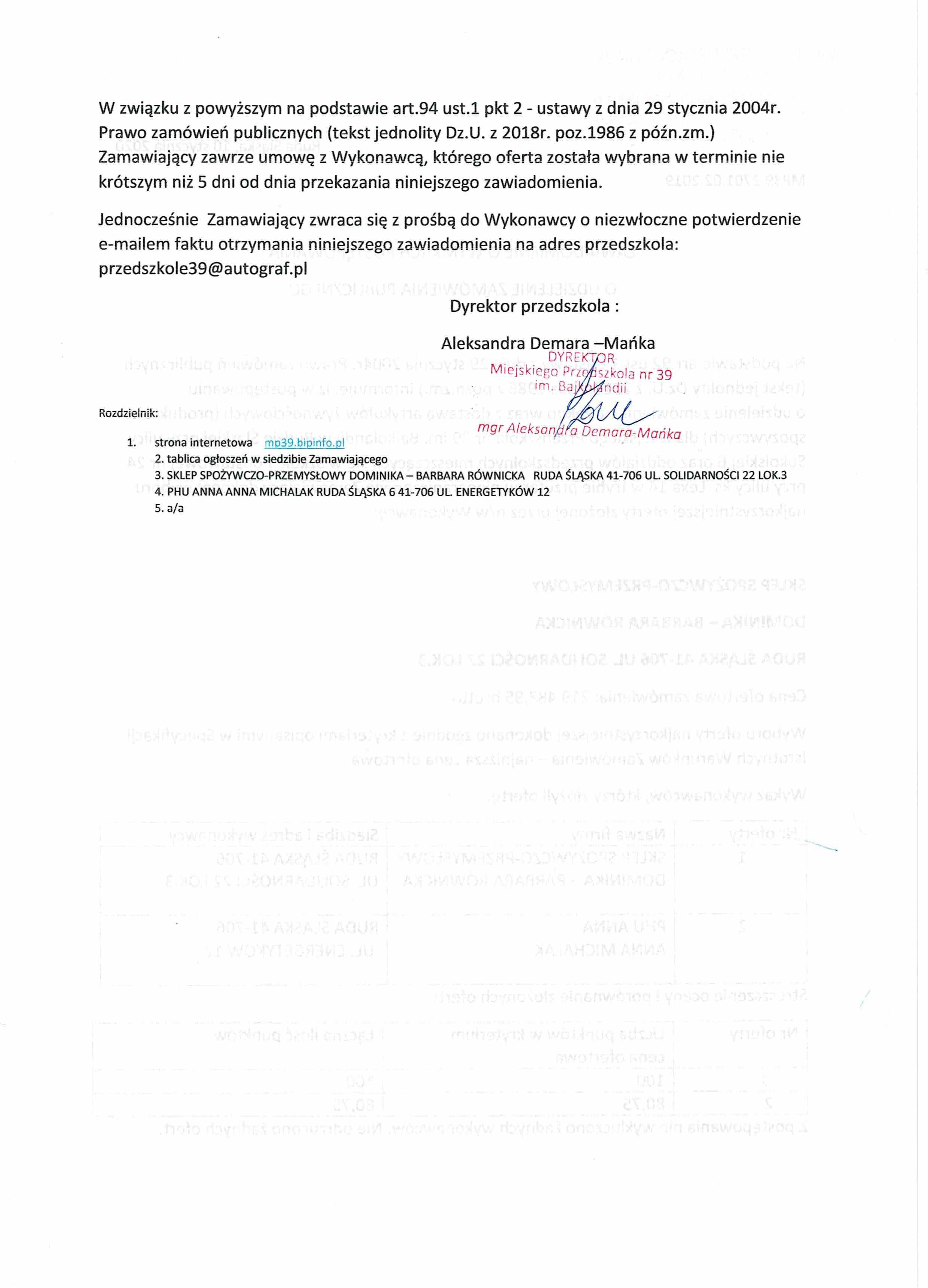 Miejskie Przedszkole Nr 39 im. Bajkolandii: Zakup wraz z dostawą artykułów żywieniowych (artykułów spożywczych) dla Miejskiego Przedszkola nr 39 im. Bajkolandii w Rudzie Śląskiej przy ulicy Sokolskiej 6